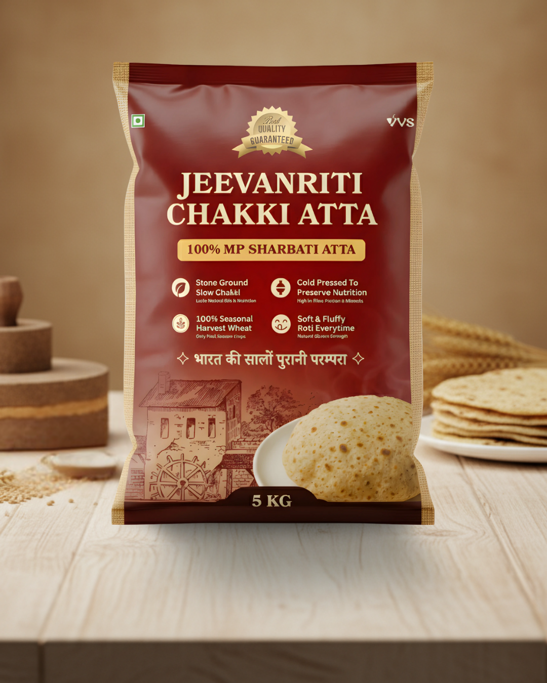 Jeevanriti Chakki Atta is made from 100% premium Sharbati whole wheat, traditionally stone-ground (chakki-milled) in small batches. This preserves its natural freshness, aroma, and nutritional value, ensuring you get softer rotis.